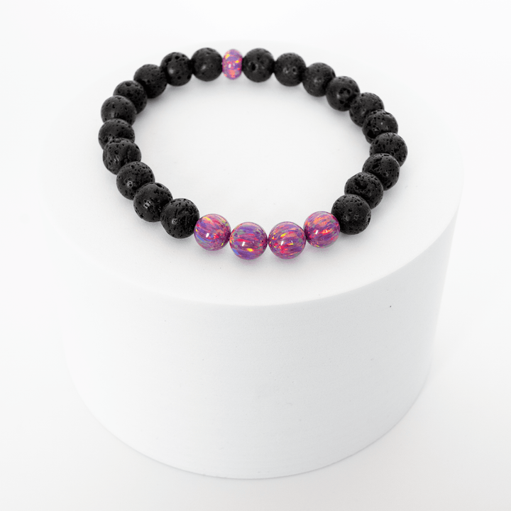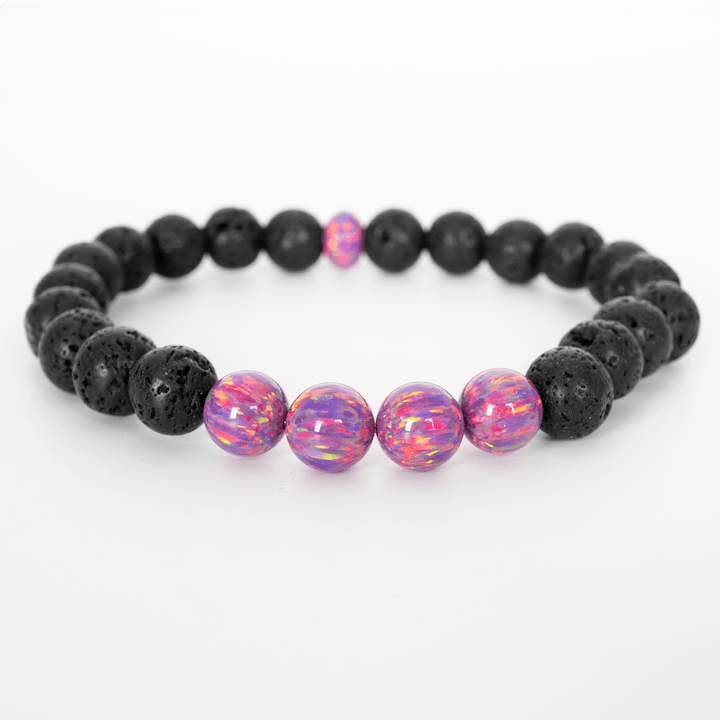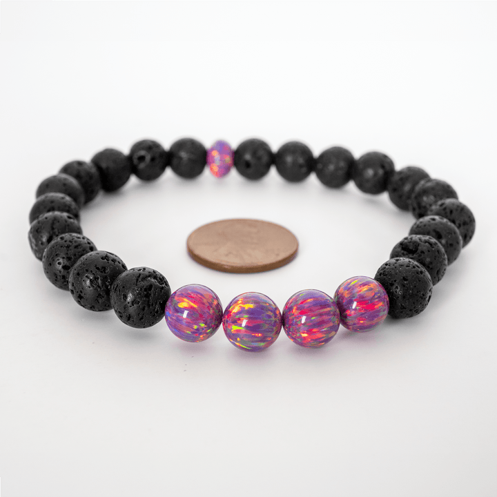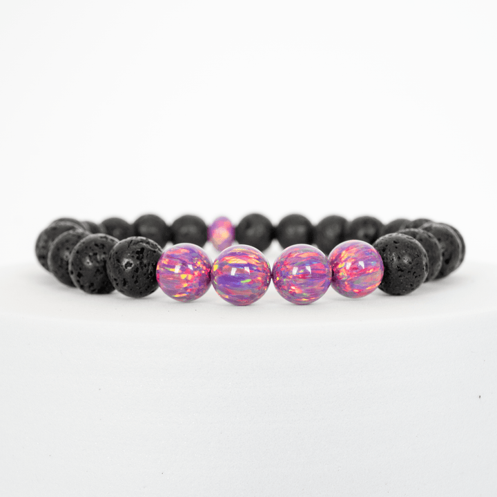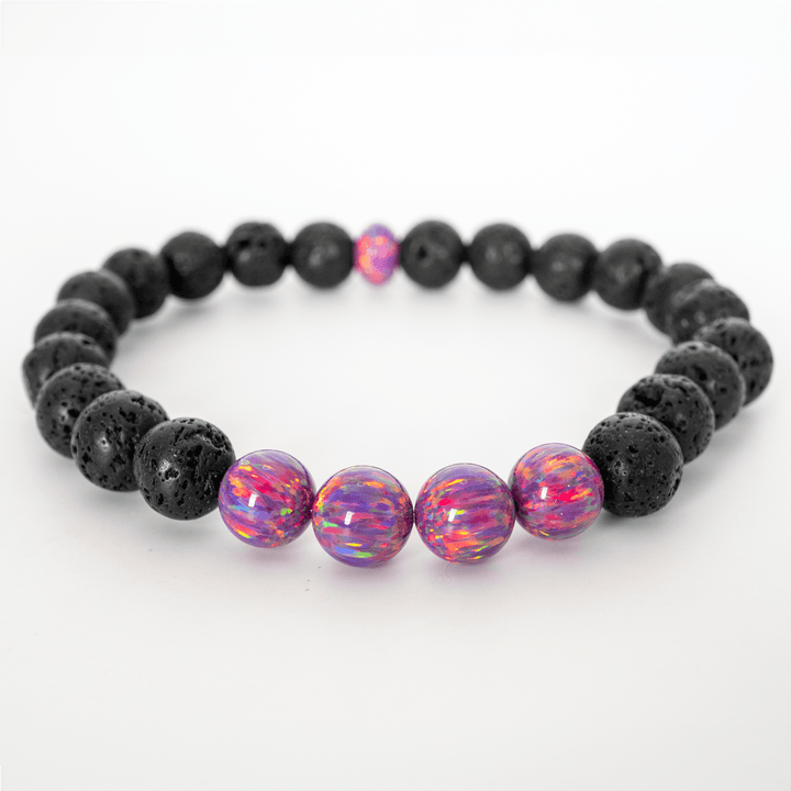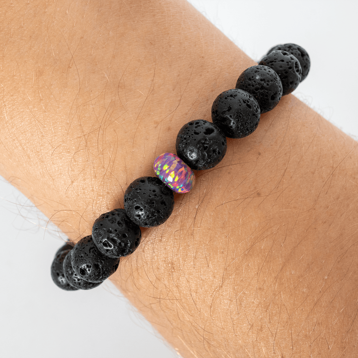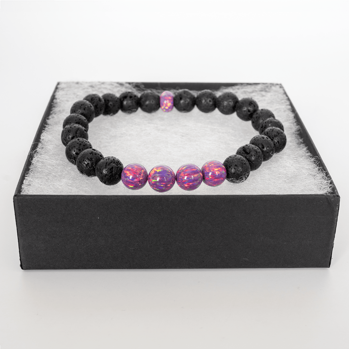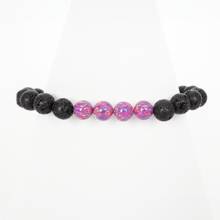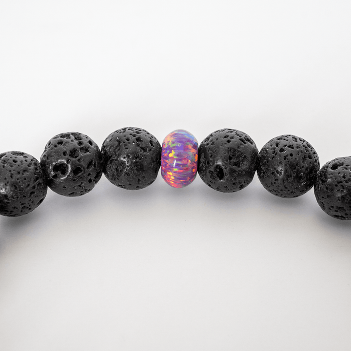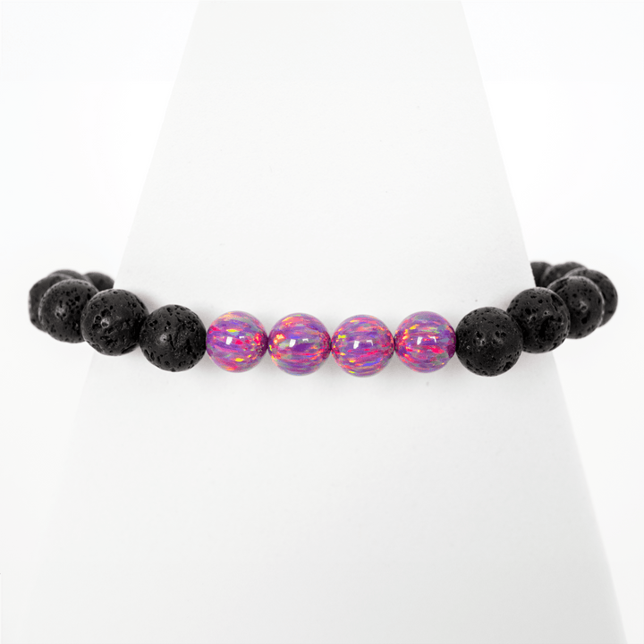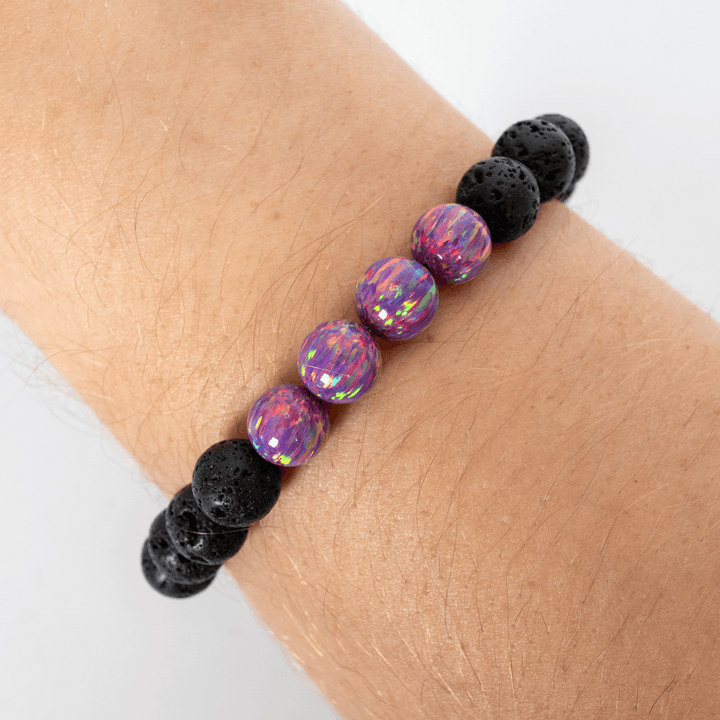 Handcrafted for both men and women, this versatile bracelet combines the grounding power of lava stones with the captivating fire of amethyst opal. The porous lava beads are perfect for diffusing essential oils, while the unique lab-created opal beads shimmer with a vibrant play of purple, red, and blue tones. Itβs an ideal gift and a perfect way to add a personalized touch to any look.