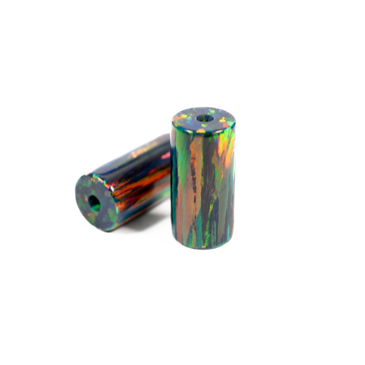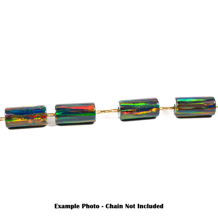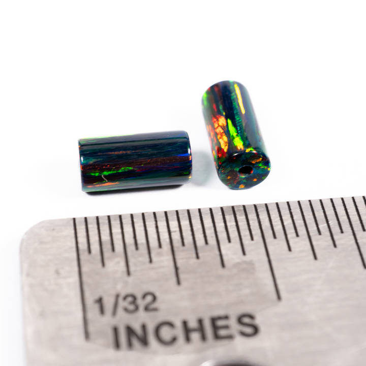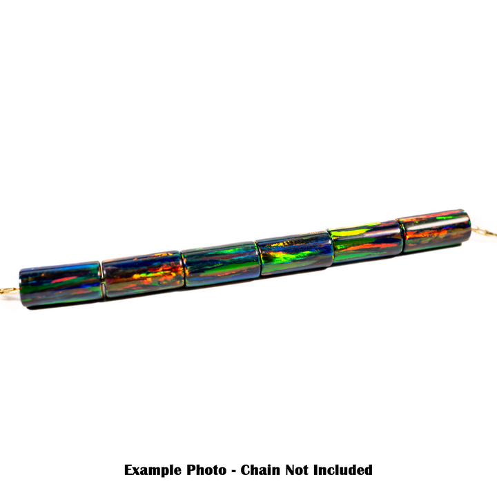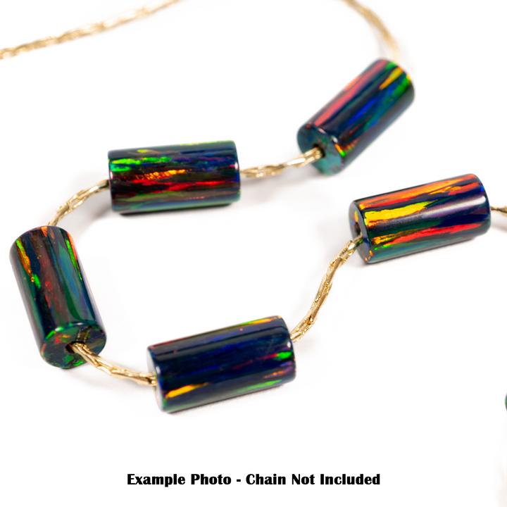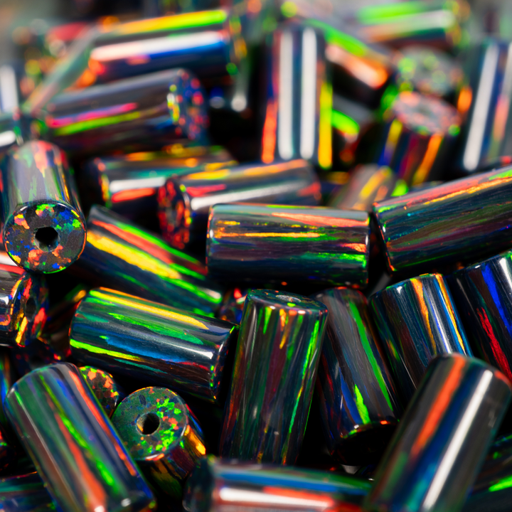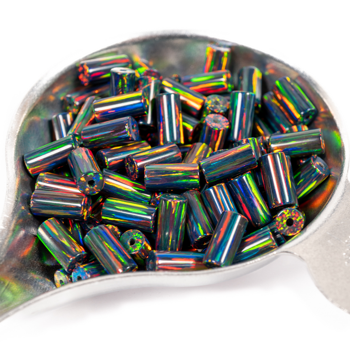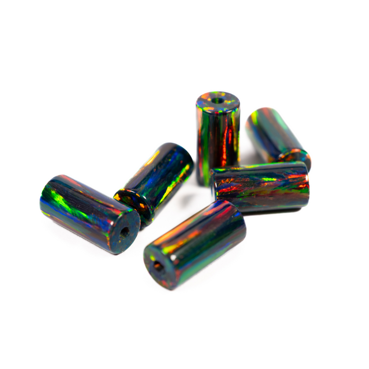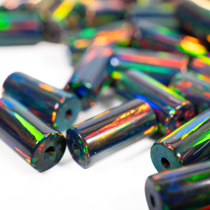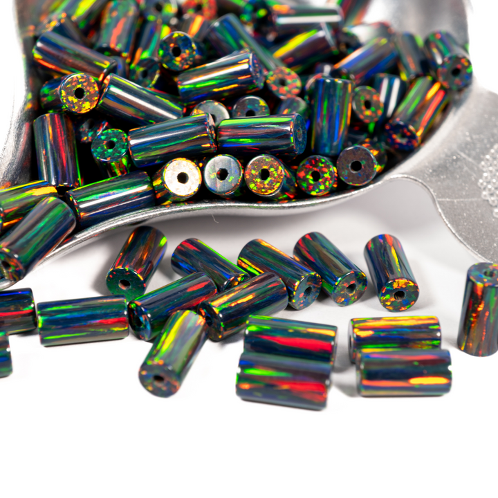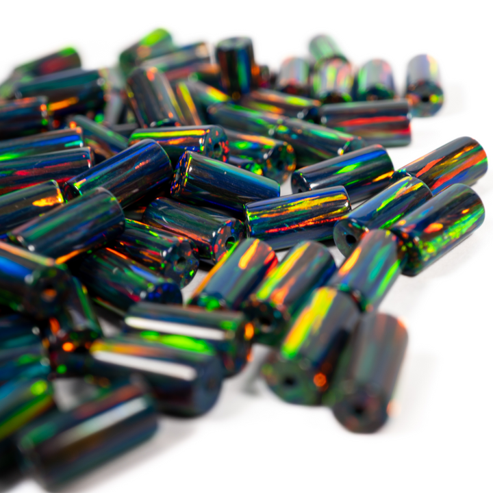 Unleash the power of a roaring fire with our bestselling Black Fire Opal Tube Beads. These iconic lab-created opal beads feature a modern cylinder shape, perfect for energetic designs. Each 4x8mm bead is made of genuine synthetic opal, featuring a deep black base that smolders with intense flashes of red, orange, and green fire. This popular shape is a must-have for bold beaded jewelry, including passionate statement necklaces and fiery bracelets. Stock up on these powerful synthetic opal supplies for your collection of jewelry making supplies.