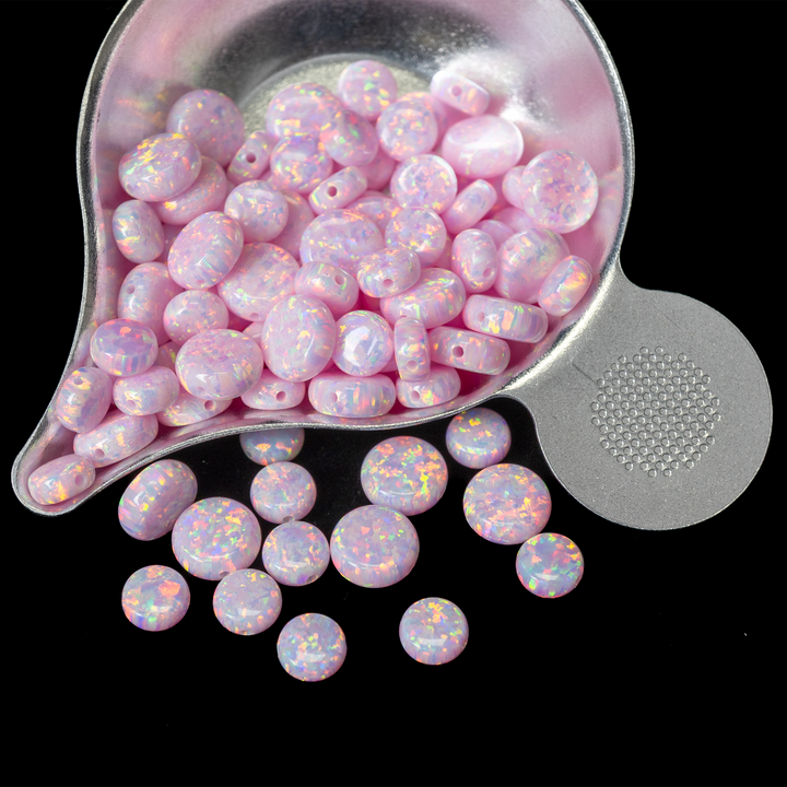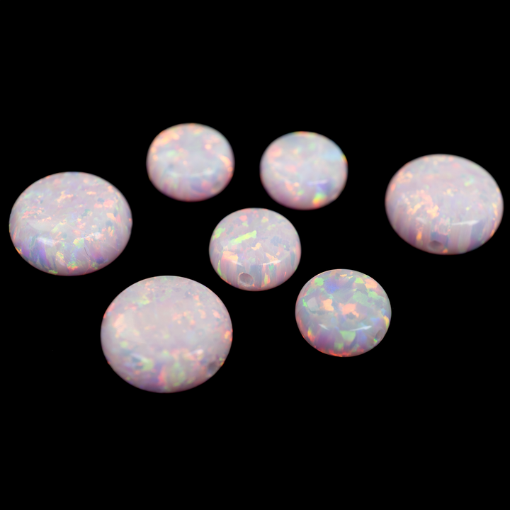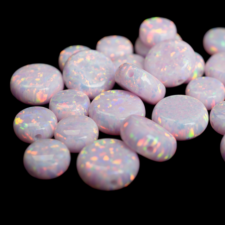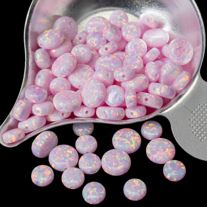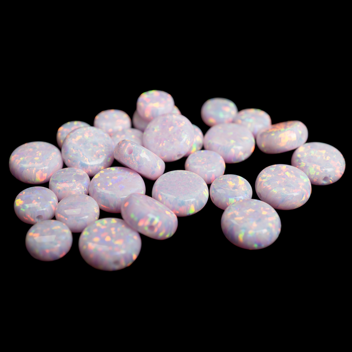 Capture the delicate beauty of springtime with our Cherry Blossom Opal Puff Coin Beads. This elegant lab-created opal features a soft, baby pink base swirled with milky white, blooming with a full spectrum of rainbow fire. The modern, gently curved coin shape offers a wide surface to showcase the opal's soft fire, creating elegant designs that lay beautifully flat. A graceful and sophisticated choice for your collection of jewelry making supplies, these synthetic opal beads bring a touch of serene, floral elegance to your designs.