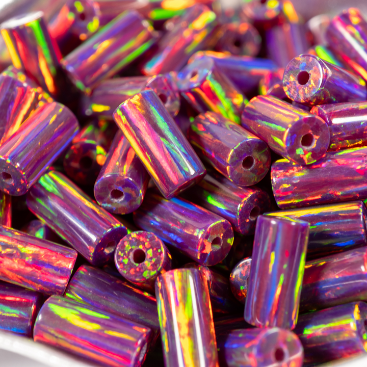 Let your projects blossom with our Orchid Opal Tube Beads. These gorgeous lab-created opal beads feature a modern cylinder shape, inspired by the stunning orchid flower. Each 4x8mm bead is made of genuine synthetic opal, featuring a deep purple base that cascades with a vibrant rainbow fire. This rich shape is a delicate choice for beaded jewelry, including floral-themed necklaces and sophisticated bracelets. Add these elegant synthetic opal supplies to your collection of jewelry making supplies.