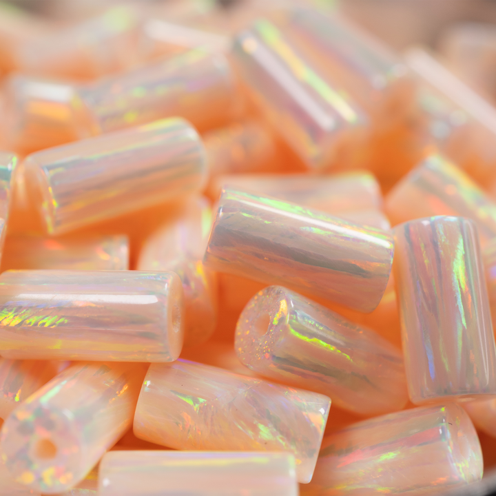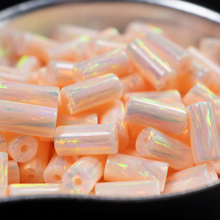 Embrace the gentle warmth of our Peach Fuzz Opal Tube Beads. These beautiful lab-created opal beads feature a modern cylinder shape and a soft, velvety pastel peach base. Each 4x8mm bead is filled with an ethereal shimmer, casting a soft glow with a delicate rainbow fire. This nurturing shape is an elegant choice for beaded jewelry, including gentle necklaces and sophisticated bracelets. Add these synthetic opal supplies to your collection of jewelry making supplies.