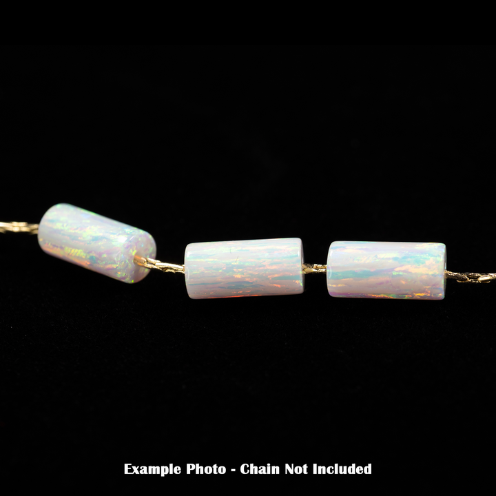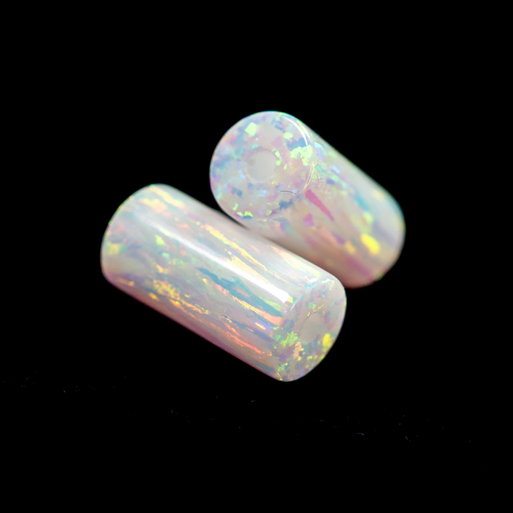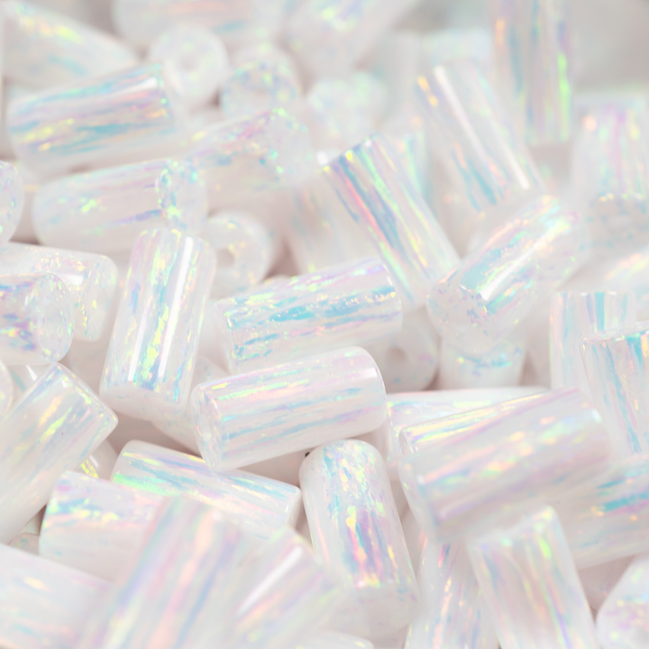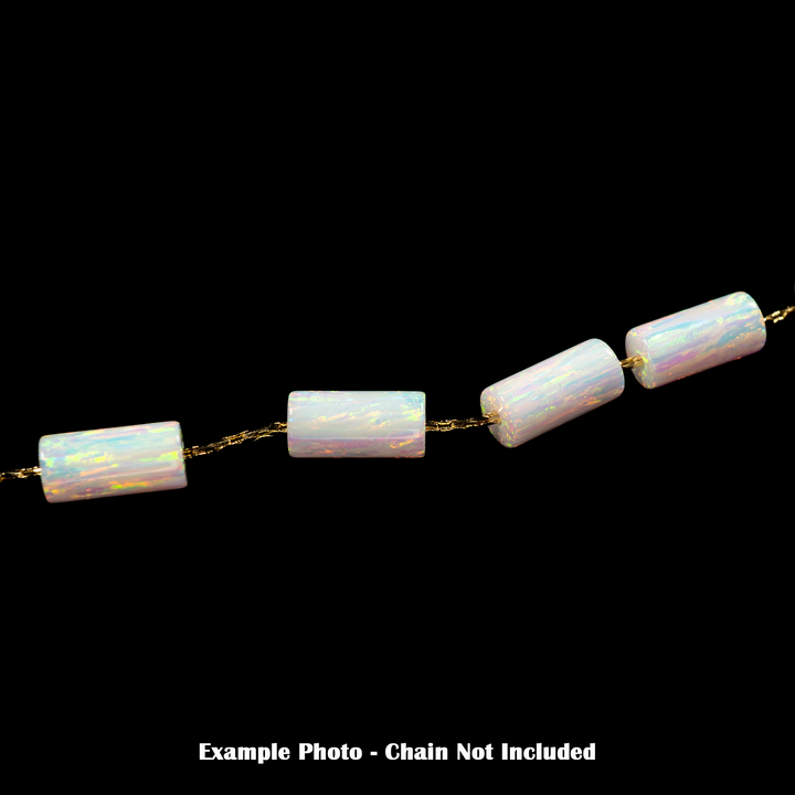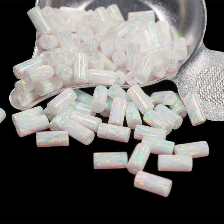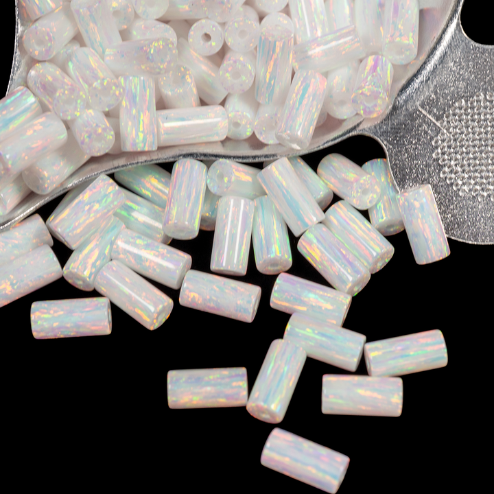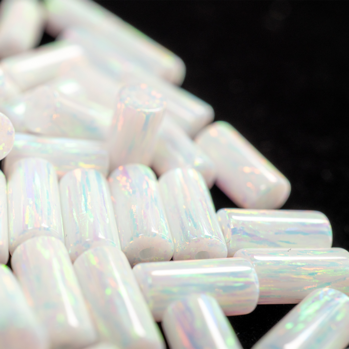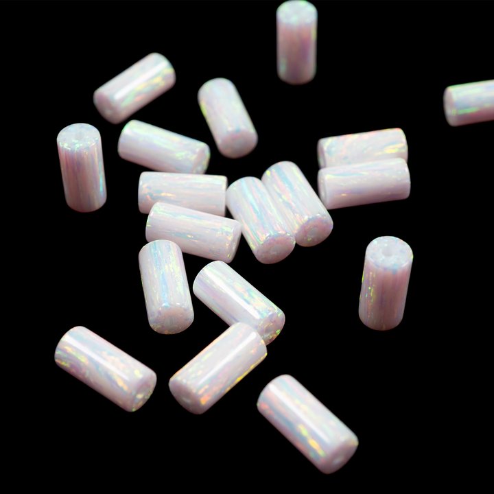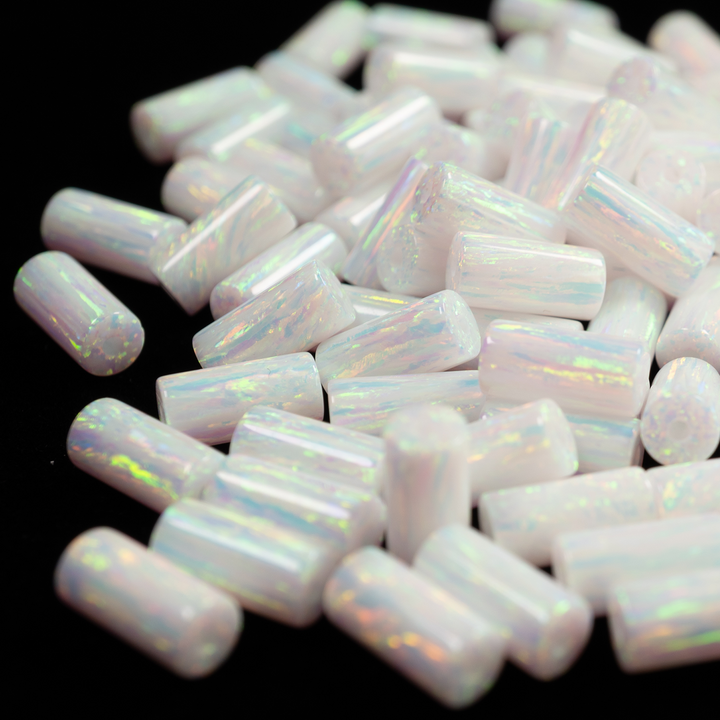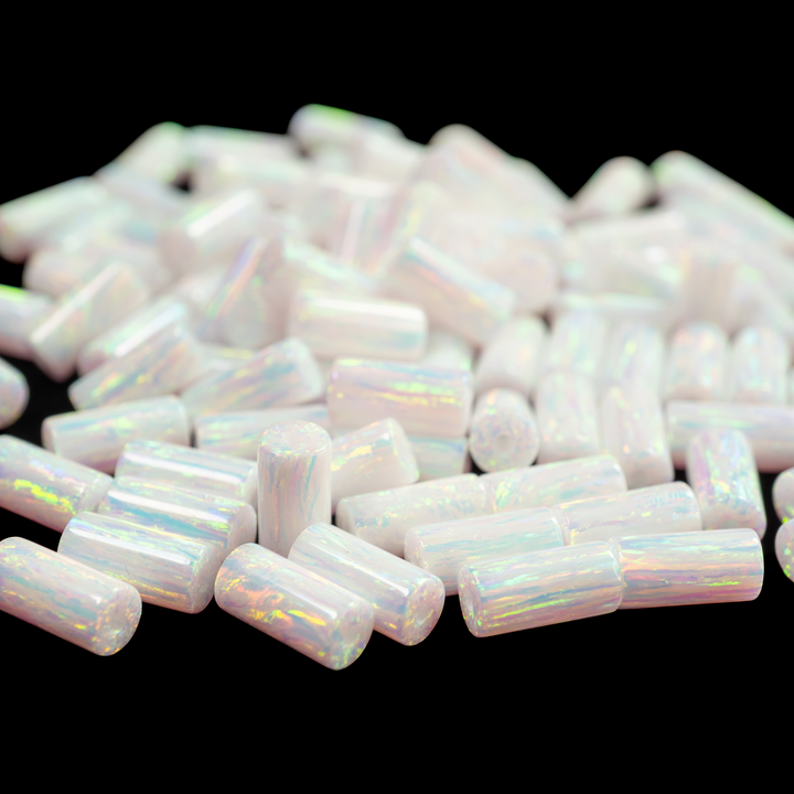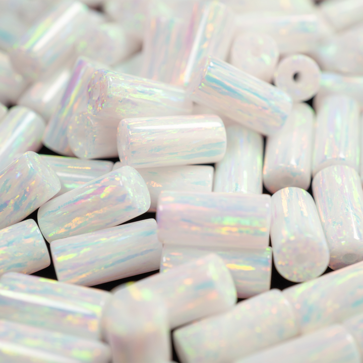 Create sleek, linear jewelry designs with our Pearl White Opal Tube Beads. These practical lab-created opal beads provide a modern cylinder shape that is easy to string and stack. Each 4x8mm bead is made of genuine synthetic opal, displaying beautiful flashes of rainbow fire within its pristine white color. This shape is a must-have for clean, everyday beaded jewelry, including popular minimalist necklaces and layered bracelets. Stock up on these versatile synthetic opal supplies for your collection of jewelry making supplies.