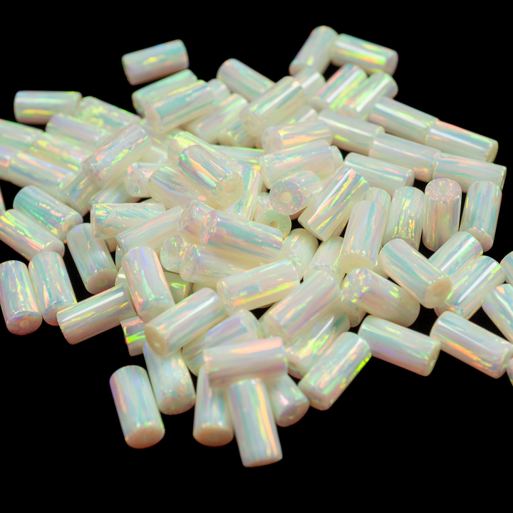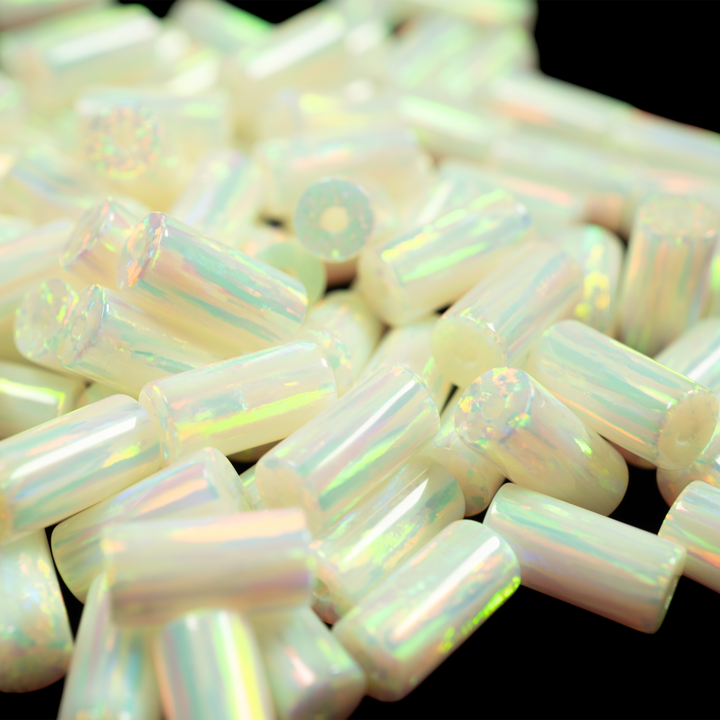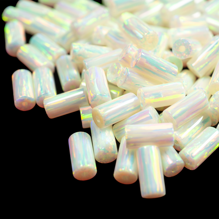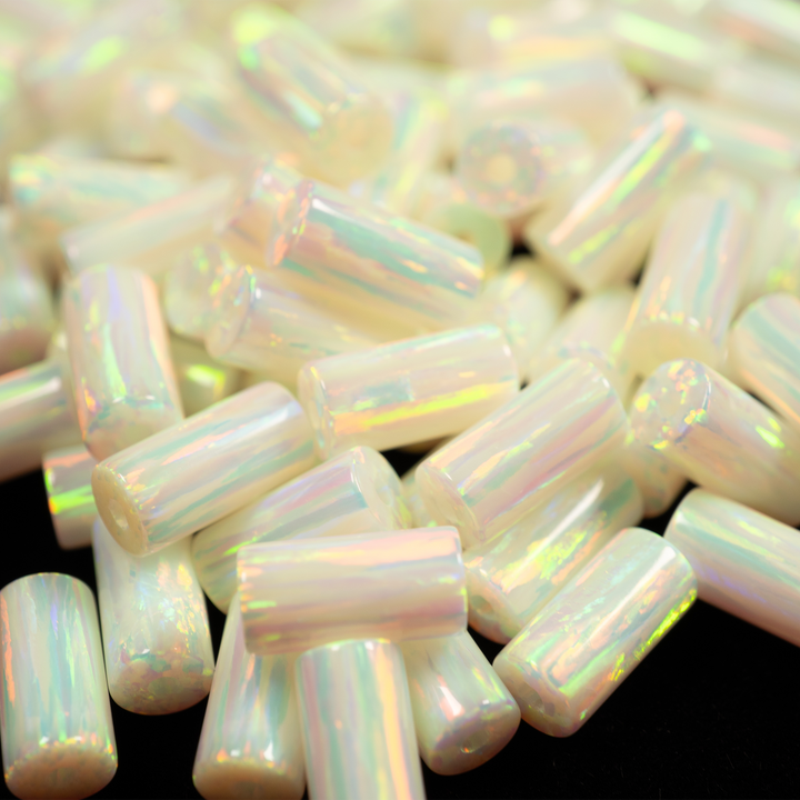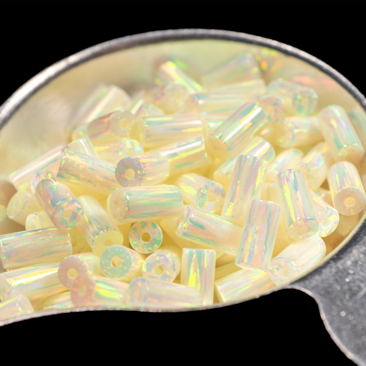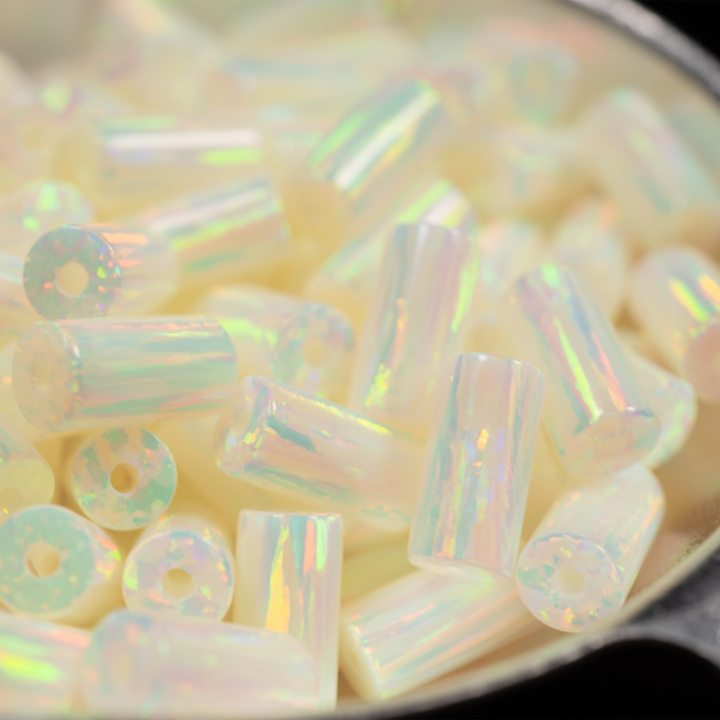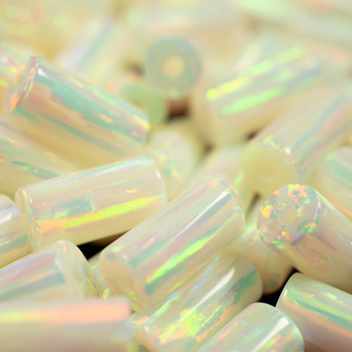 Capture the sweet warmth of a summer day with our Taffy Yellow Opal Tube Beads. This cheerful lab-created opal features a modern cylinder shape and a soft, butter yellow base that's been stretched with a vibrant rainbow fire. This sunny shape is a delightful choice for beaded jewelry, including cheerful necklaces and stacked bracelets. Add these popular synthetic opal supplies to your collection of jewelry making supplies.