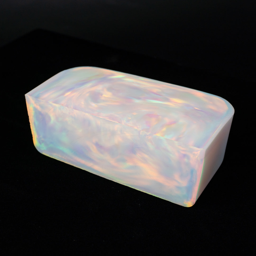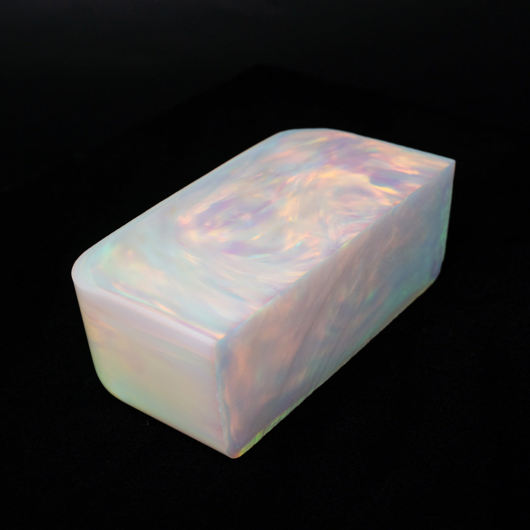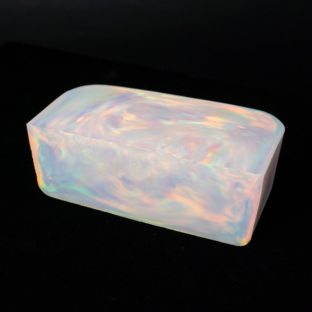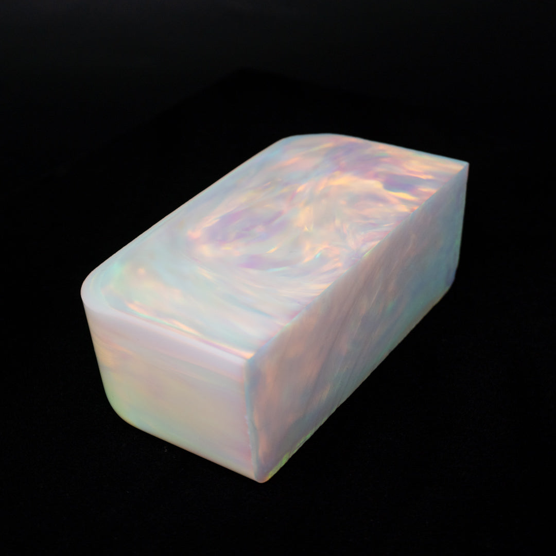 The rough block of lab-grown opal is now ready to be transformed. Just like a natural gemstone, it is skillfully cut, shaped, and polished to reveal the breathtaking patterns and colors locked inside. This process results in a stunning material ready for endless creative applications.