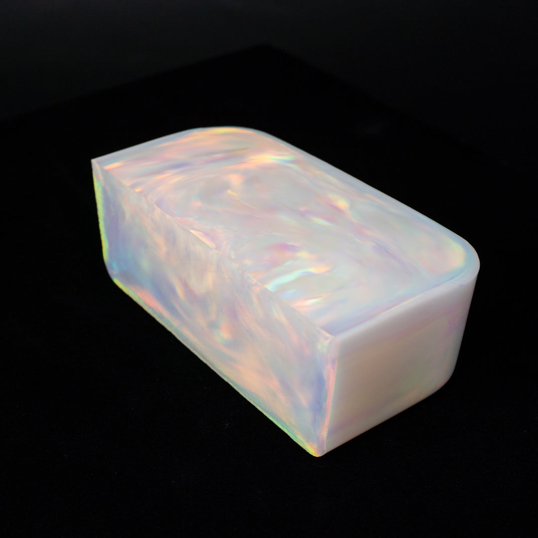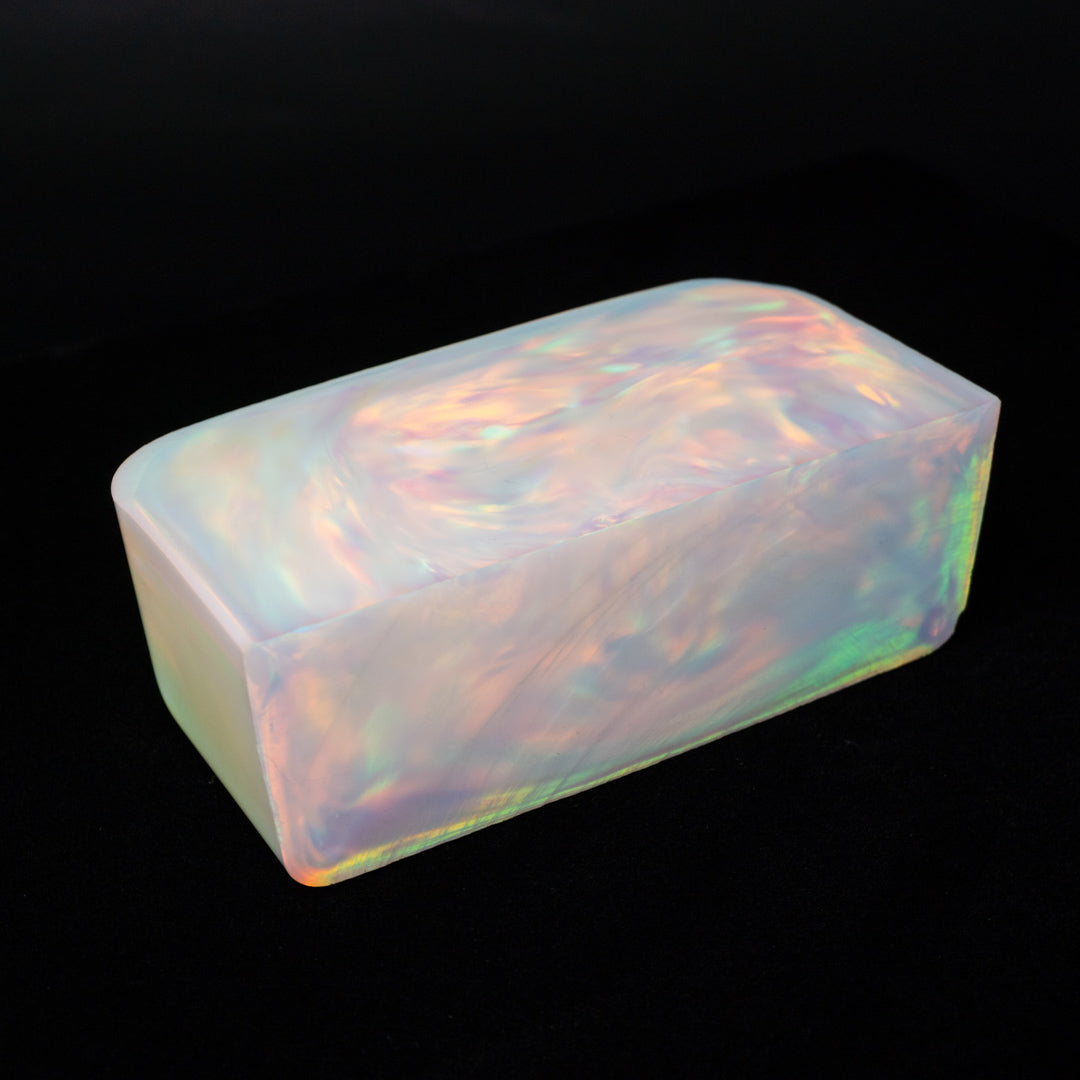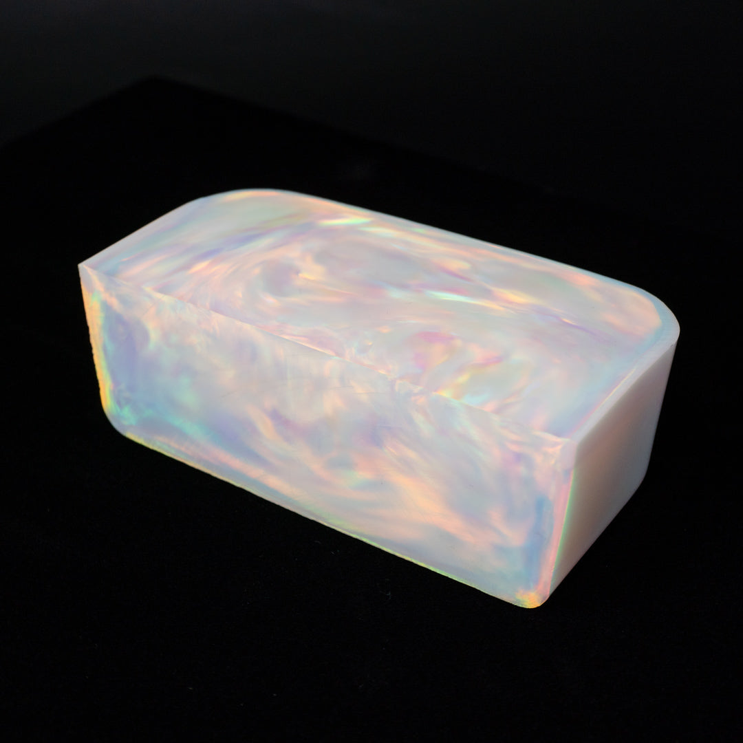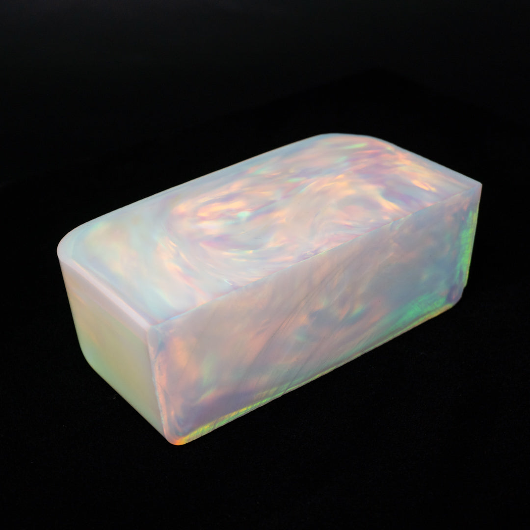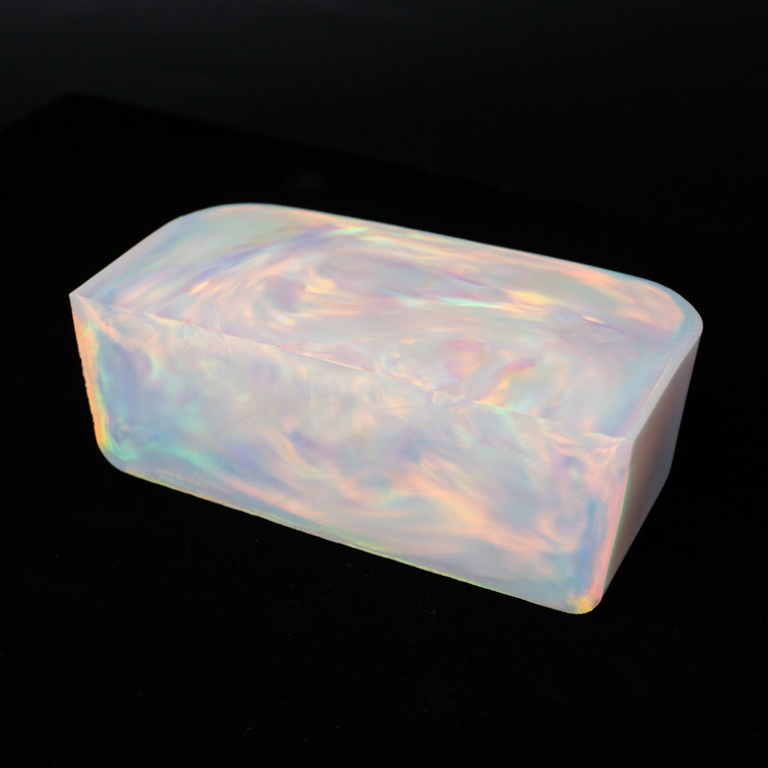 The rough block of lab-grown opal is now ready to be transformed. Just like a natural gemstone, it is skillfully cut, shaped, and polished to reveal the breathtaking patterns and colors locked inside. This process results in a stunning material ready for endless creative applications.