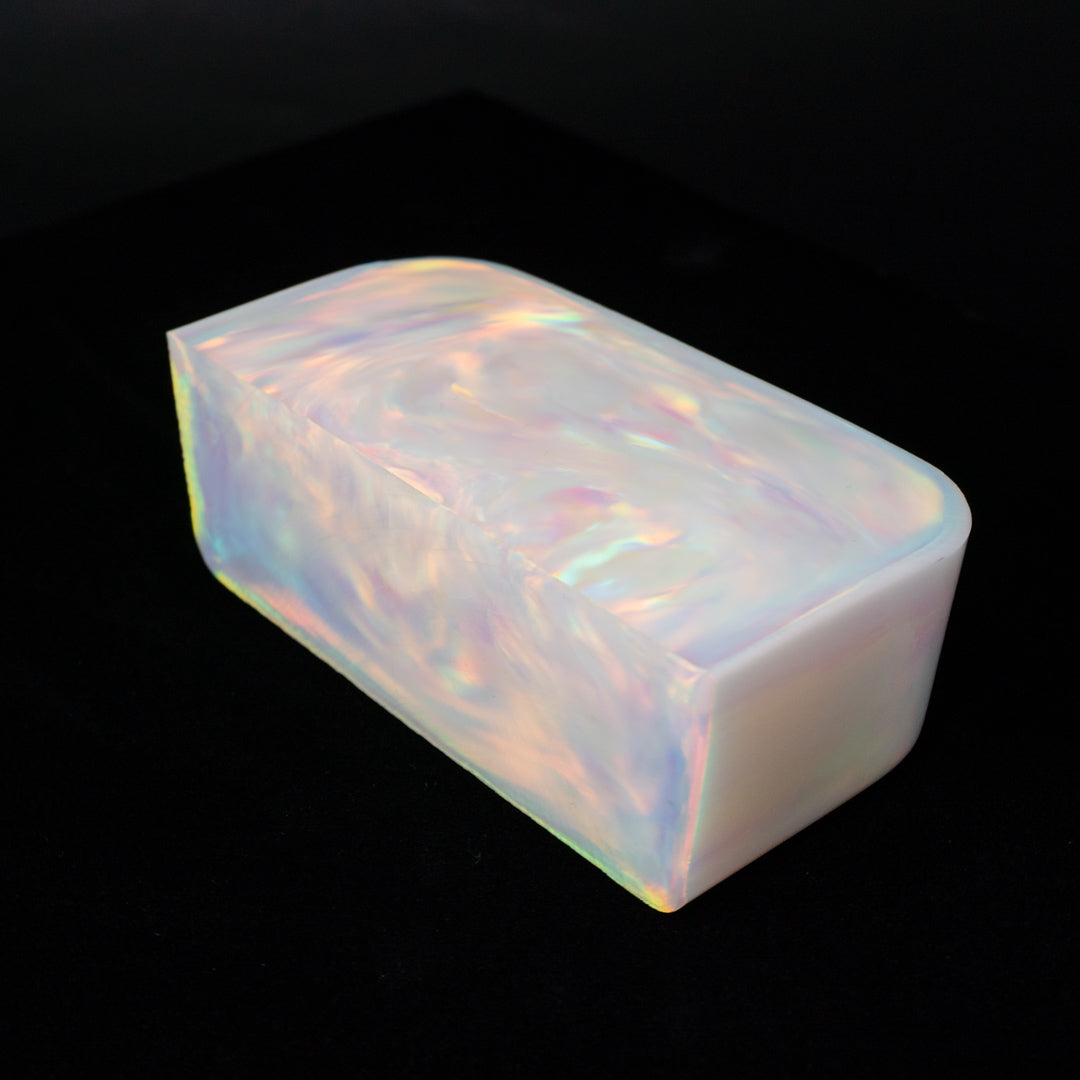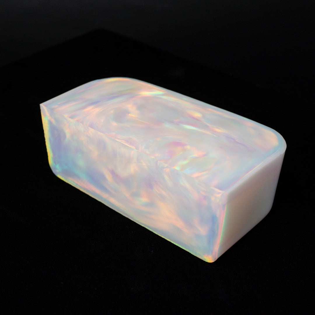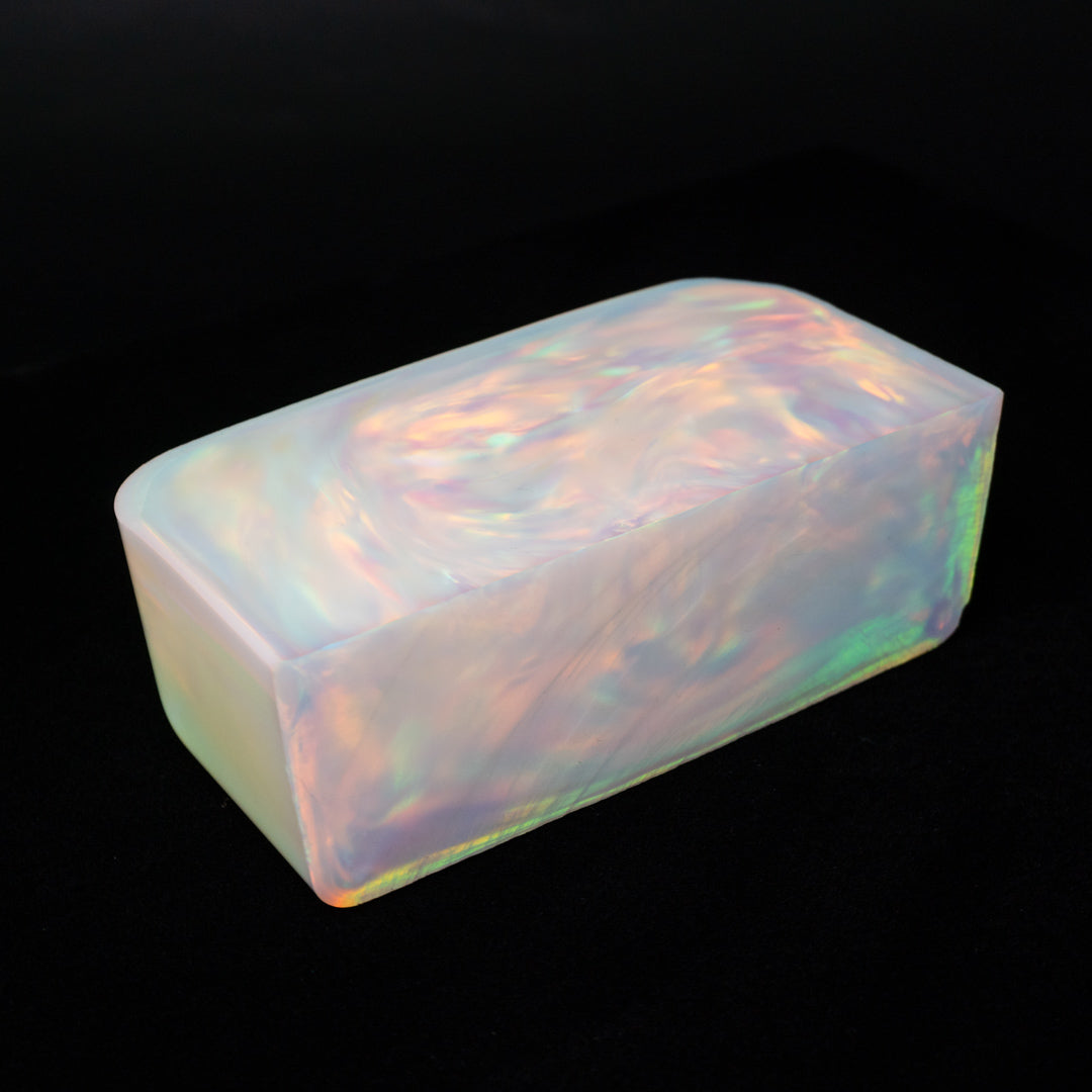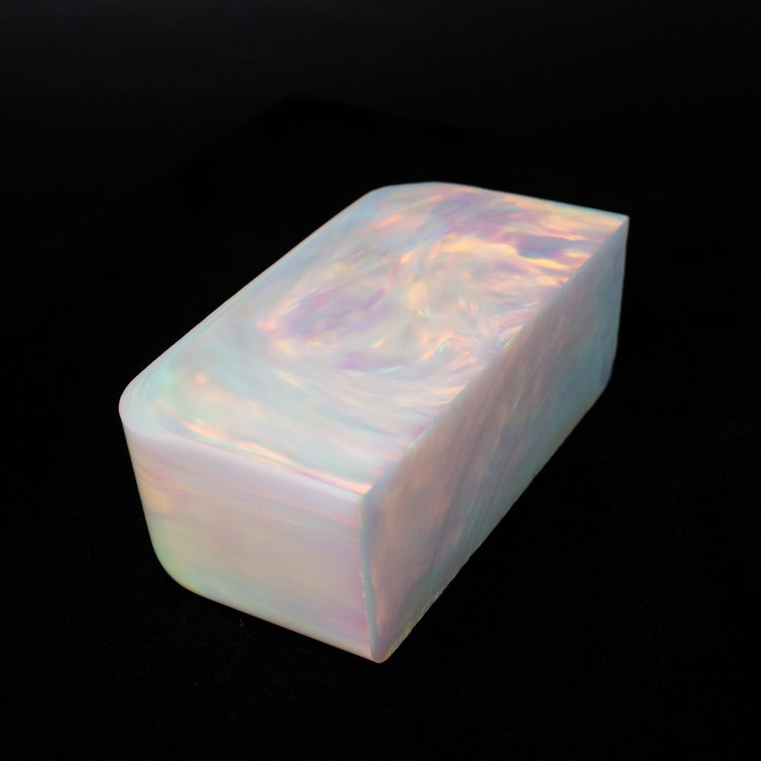 The rough block of lab-grown opal is now ready to be transformed. Just like a natural gemstone, it is skillfully cut, shaped, and polished to reveal the breathtaking patterns and colors locked inside. This process results in a stunning material ready for endless creative applications.