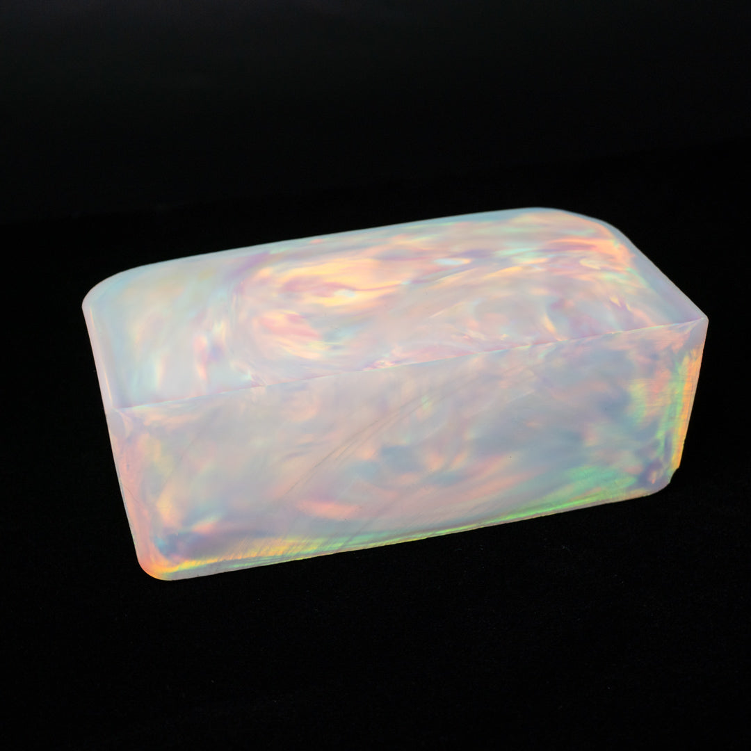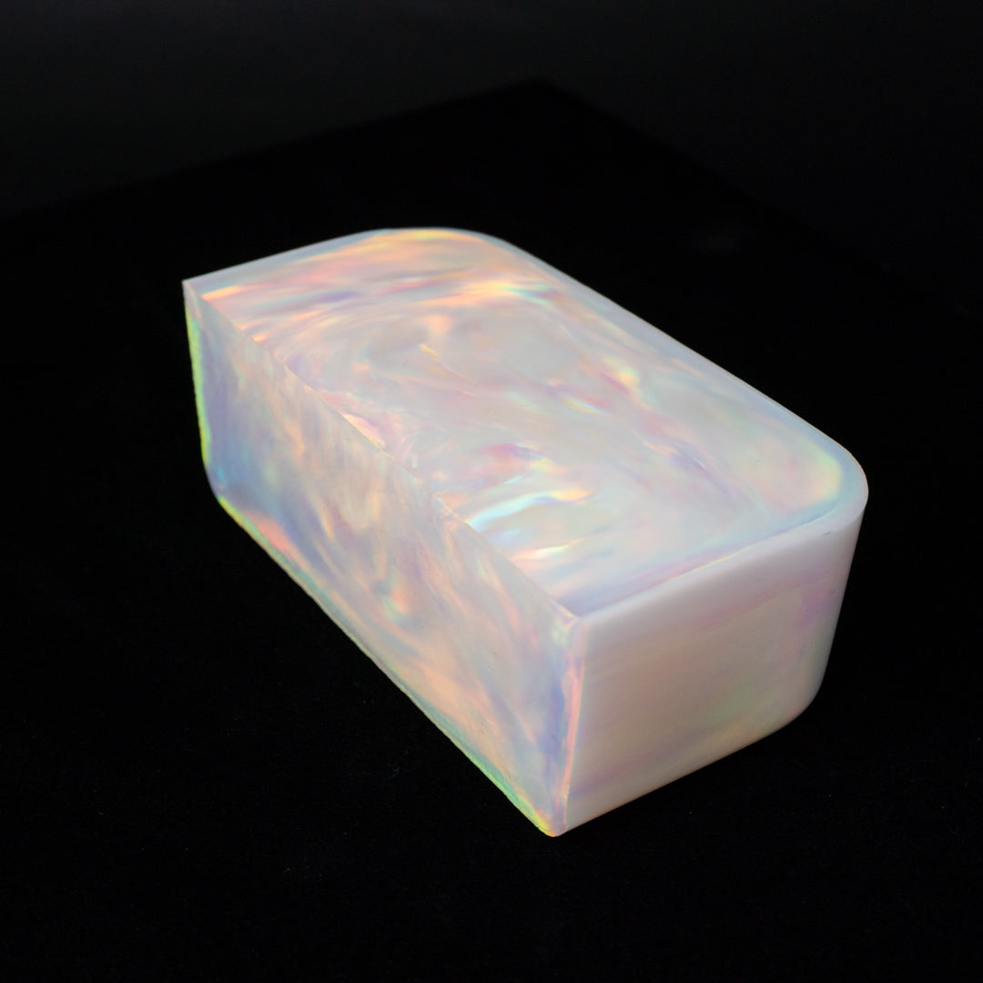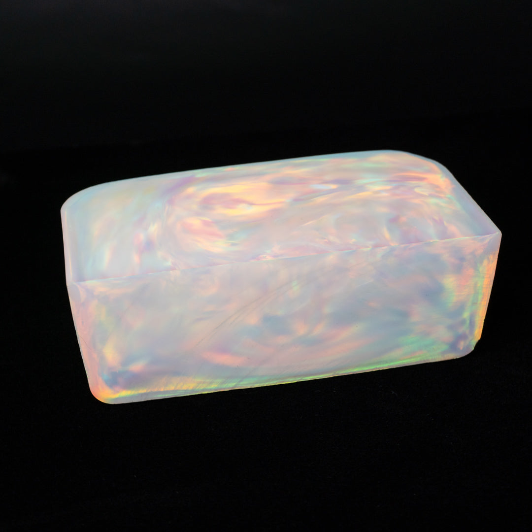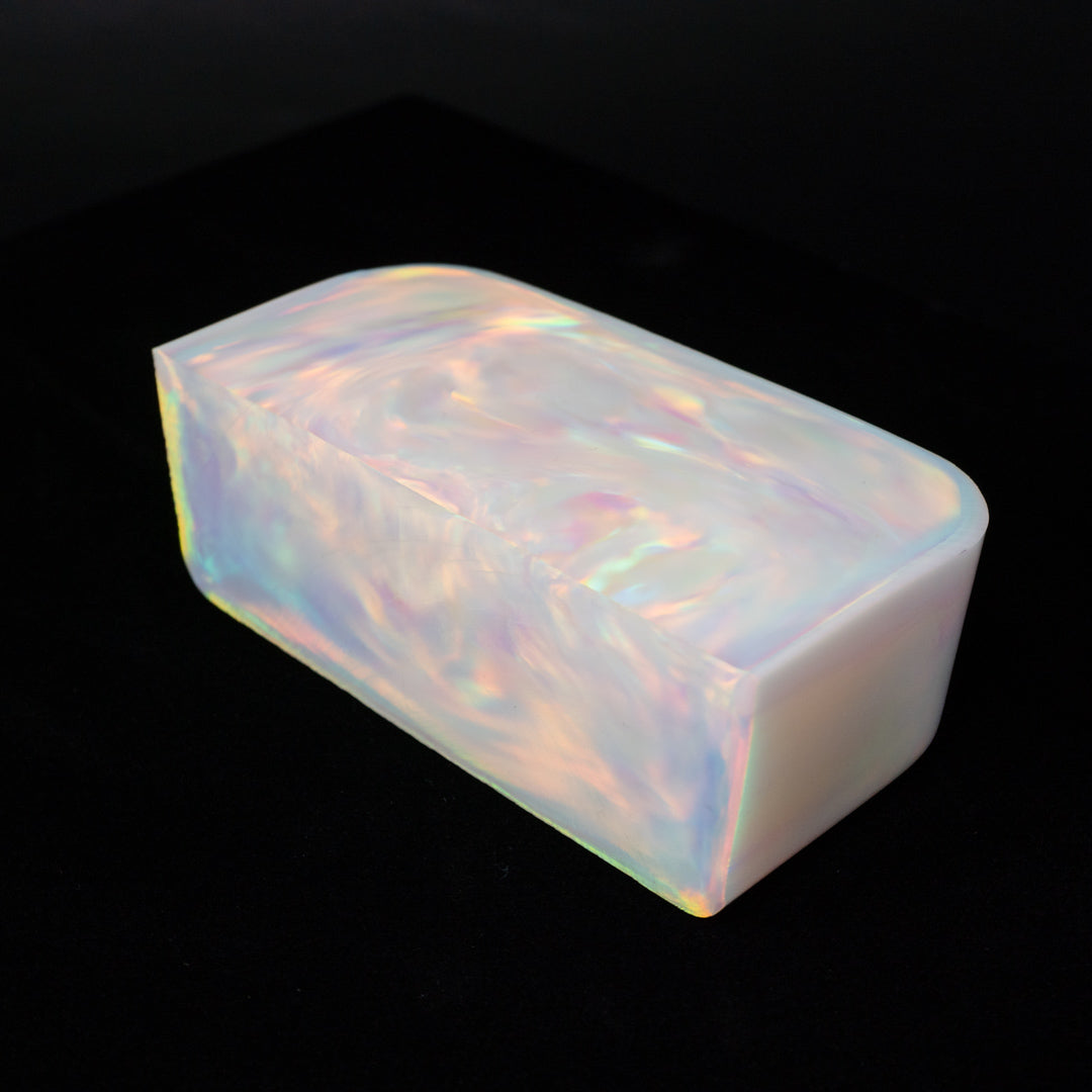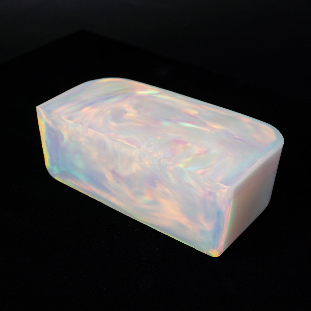The rough block of lab-grown opal is now ready to be transformed. Just like a natural gemstone, it is skillfully cut, shaped, and polished to reveal the breathtaking patterns and colors locked inside. This process results in a stunning material ready for endless creative applications.